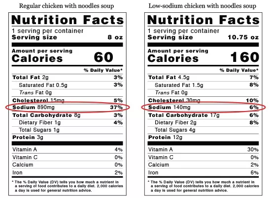 Hàm lượng natri được khoanh tròn trên bao bì về các thông tin dinh dưỡng bên dưới (xem Hình 1). Bạn có thể thấy miligam natri và phần trăm giá trị natri hàng ngày trên mỗi khẩu phần. Súp gà thông thường có 37% giá trị natri hàng ngày (tương ứng khoảng 890 mg), đây là mức cao. Phiên bản ít natri có 6% (140 mg), đây là lựa chọn tốt hơn với chế độ ăn nhạt.