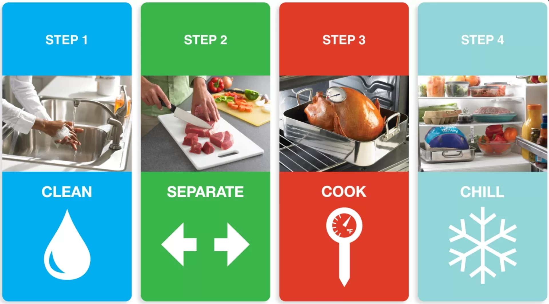 - Dùng đĩa sạch để đựng thức ăn đã nấu chín. Không sử dụng lại đĩa từng chứa thịt cá sống trừ khi đã rửa kỹ bằng nước ấm và xà phòng.