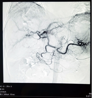 Ảnh 2: Hình ảnh động mạch thân tạng chụp bằng máy chụp mạch số hóa xóa nền: động mạch gan trái và phải còn đang có dấu hiệu chảy máu ra ngoài gan.