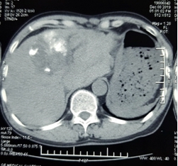Bệnh nhân Ngô Văn S., 59 tuổi, trú tại Hoàng Mai – Hà Nội mắc ung thư gan, khối u có đường kính 6 cm, lồi khỏi mặt dưới gan trái, đã được nút mạch hóa chất cách đây 3 tháng, sức khỏe ổn định. Đến sáng chủ nhật ngày 8/12/2019, bệnh nhân được người nhà đưa đến Bệnh viện Ung Bướu Hà Nội trong tình trạng đau bụng dữ dội vùng thượng vị, hoa mắt chóng mặt, da nhợt nhạt, mạch nhanh 140 lần/phút, huyết áp tụt còn 90/70 mmHg.