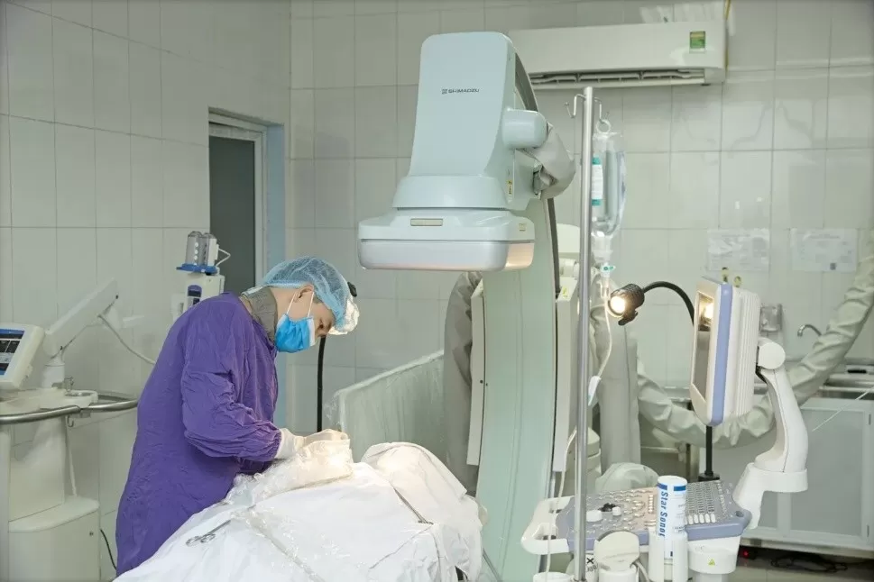 Hình ảnh bác sĩ chẩn đoán can thiệp đặt cổng truyển hoá chất dưới hướng đẫn siêu âm và DSA.