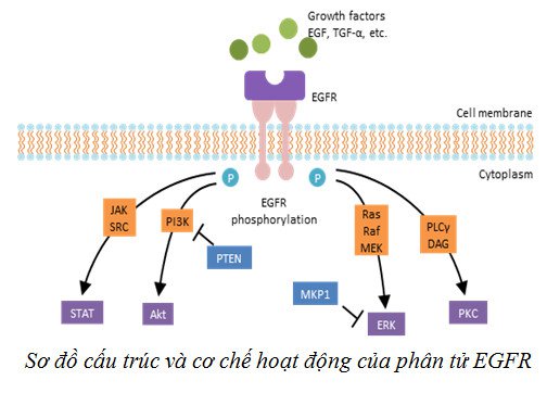 Đối với ung thư phổi, đột biến EGFR (Epidermal growth factor receptor - thụ thể của yếu tố tăng trưởng biểu bì) là đích nhắm điều trị đầu tiên được chấp thuận và hiện vẫn tiếp tục được nghiên cứu đến ngày nay. Đây là loại đột biến gen thường gặp nhất ở bệnh nhân ung thư phổi, đặc biệt là trên dân số Châu Á, bệnh nhân nữ, không hút thuốc lá và tế bào ung thư phổi có nguồn gốc từ biểu mô tuyến. Theo nghiên cứu, ở Việt Nam, cứ 100 bệnh nhân ung thư phổi có khoảng 40-50 người mang đột biến gen EGFR. Trong các dạng đột biến EGFR thì 85% là đột biến “kinh điển” ở Exon 19 và Exon 21. Khi đột biến gen EGFR xảy ra, các thụ thể tyrosine kinase này tự bản thân có khả năng kích hoạt con đường nội bào, dẫn đến quá trình tăng sinh một cách vô tổ chức của các tế bào ung thư.