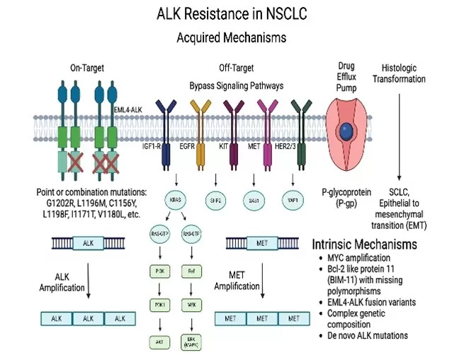 Hình 2: Sơ đồ cơ chế tác động của ALK-TKI và đường truyền tín hiệu ALK trong tế bào ung thư.