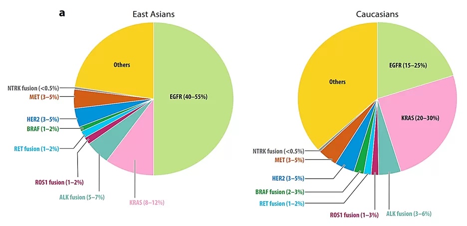 Theo các dữ liệu đã được thống kê, tỷ lệ xuất hiện các đột biến EGFR, ALK, ROS1, KRAS… có thể khác nhau tuỳ từng khu vực, rõ nét nhất là giữa nhóm dân Châu Á và dân số các khu vực còn lại.