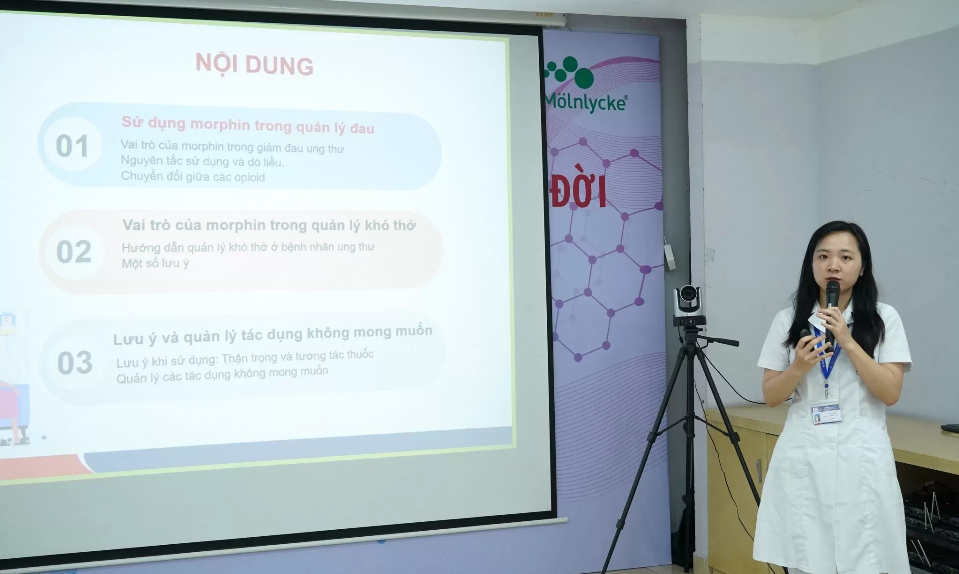 Tiếp theo, DS. Điều Thị Ngọc Châu - Khoa Dược đã trình bày về chủ đề “Sử dụng morphin trong quản lý triệu chứng trên người bệnh ung thư.” Bài trình bày tập trung vào các nguyên tắc sử dụng morphin, điều chỉnh liều, chuyển đổi giữa các opioid và cách quản lý các tác dụng phụ như táo bón, buồn nôn và ức chế hô hấp. DS. Châu cũng chia sẻ các phương pháp để kiểm soát các triệu chứng khác liên quan đến điều trị ung thư.