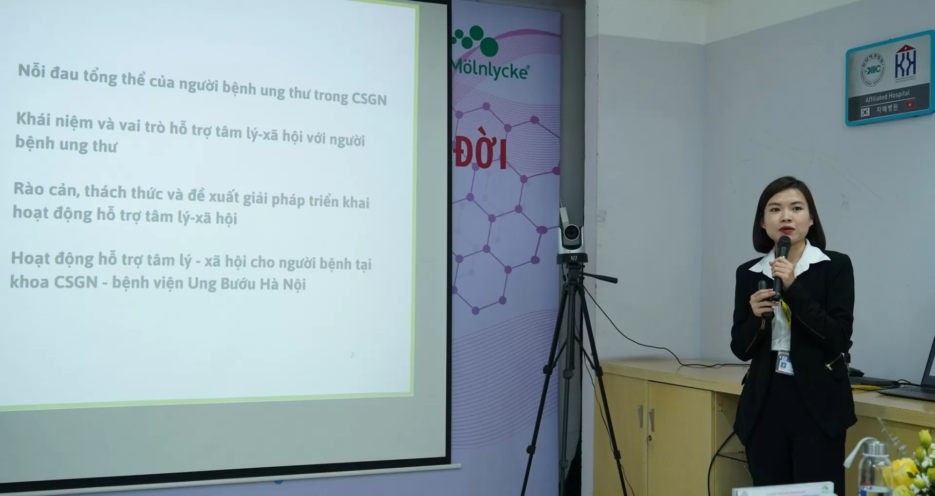 Cuối cùng ThS. Nguyễn Hà My – Phòng Quản lý chất lượng – Công tác xã hội đã có bài trình bày ấn tượng về hỗ trợ tâm lý - xã hội trong chăm sóc giảm nhẹ cho bệnh nhân ung thư. ThS. My chia sẻ về các hình thức hỗ trợ tâm lý và xã hội cho bệnh nhân, bao gồm tham vấn cá nhân, trị liệu nhóm, liệu pháp nhận thức – hành vi cùng các phương pháp trị liệu tinh thần như nghệ thuật, âm nhạc và yoga. Hỗ trợ tâm lý xã hội không chỉ giúp bệnh nhân vượt qua nỗi sợ, lo âu và trầm cảm mà còn giúp họ tìm lại ý nghĩa cuộc sống trong những giai đoạn khó khăn. ThS. My cũng chỉ ra các thách thức trong việc triển khai hoạt động này, như thiếu nhân lực chuyên môn và tài chính, đồng thời đề xuất các giải pháp như phát triển chương trình đào tạo nhân lực và tích hợp hỗ trợ tâm lý - xã hội vào quy trình chăm sóc ung thư.