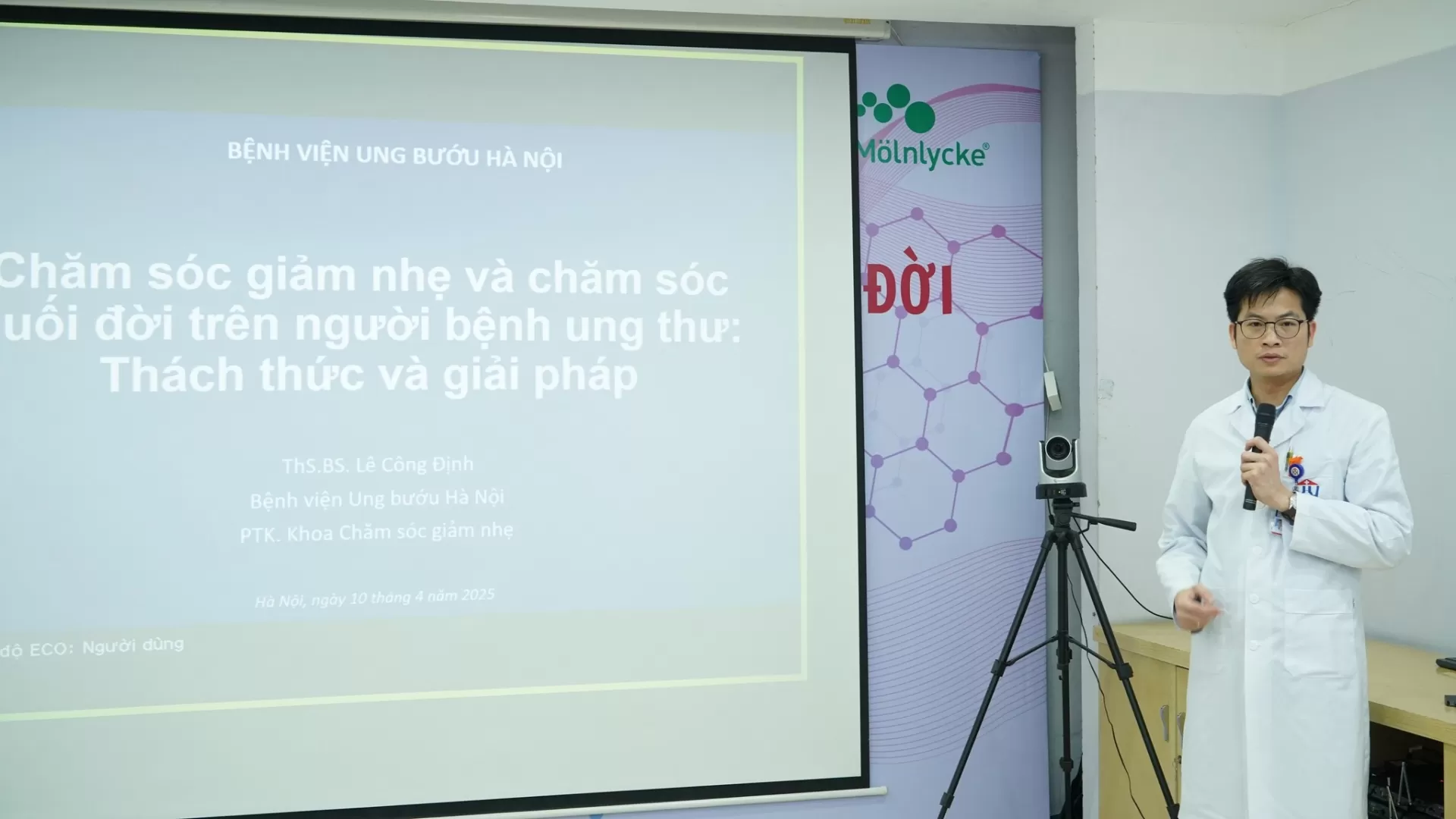 Bài trình bày mở đầu “Chăm sóc giảm nhẹ và chăm sóc cuối đời cho người bệnh ung thư: Thách thức và giải pháp” của ThS.BS. Lê Công Định - Phó Trưởng khoa Chăm sóc giảm nhẹ đã cung cấp cái nhìn tổng quan về chăm sóc giảm nhẹ, giải thích về các phương pháp giảm đau, đặc biệt là vai trò của morphin trong việc kiểm soát triệu chứng đau cho bệnh nhân ung thư. ThS.BS. Lê Công Định cũng nhấn mạnh việc tích hợp chăm sóc giảm nhẹ vào điều trị ung thư, đặc biệt khi bệnh đã tiến triển hoặc di căn, nhằm giúp bệnh nhân cải thiện chất lượng sống.