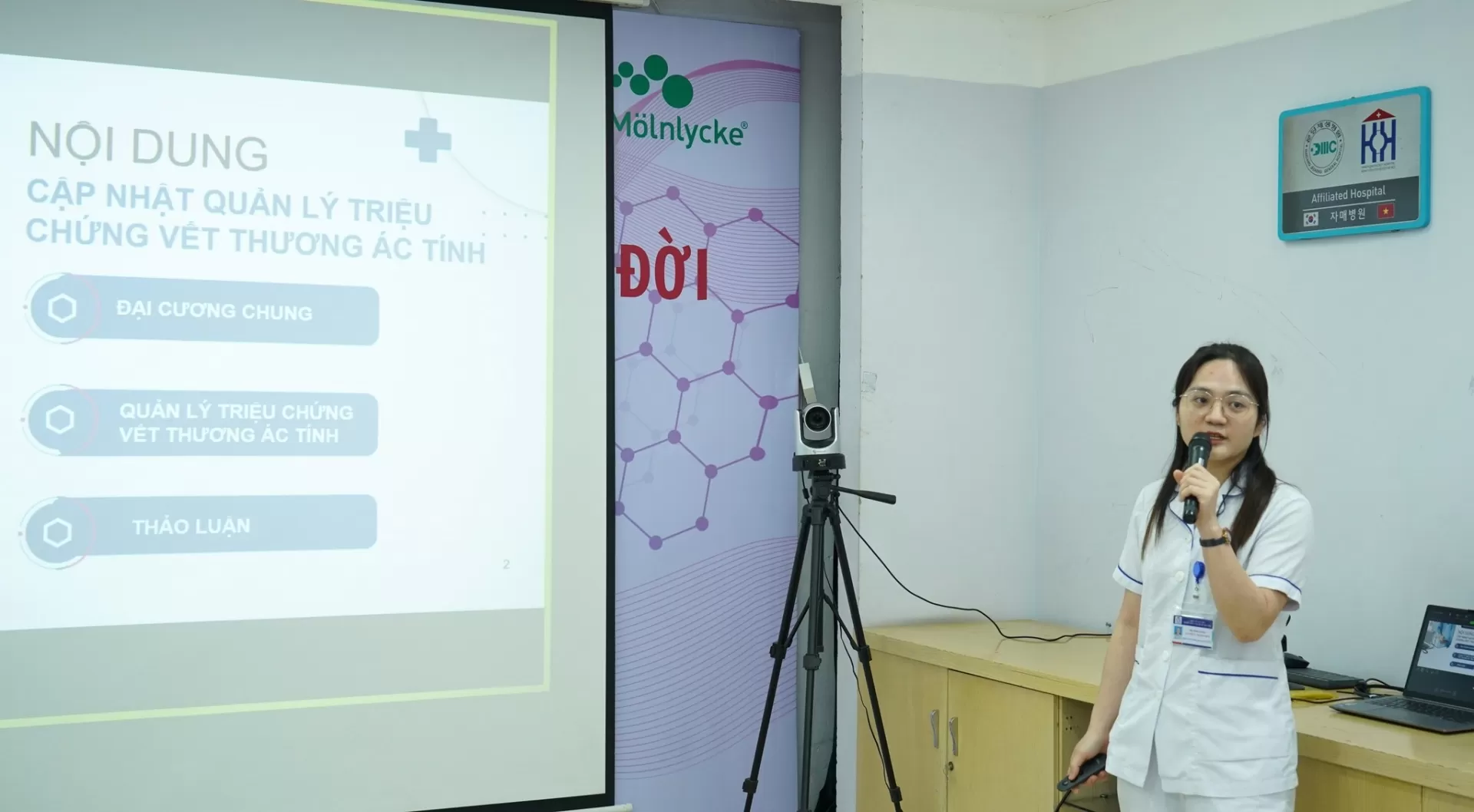 Bài trình bày của CNhĐD. Nguyễn Thị Thanh Thủy - Khoa Nội vú phụ khoa đầu cổ Theo yêu cầu đã mang đến góc nhìn chi tiết về việc quản lý vết thương ác tính ở bệnh nhân ung thư. Những vết thương này, do sự xâm nhập của tế bào ung thư vào da và mô dưới da, gây hoại tử, loét, chảy máu, và mùi hôi, là một trong những triệu chứng phổ biến của ung thư giai đoạn cuối. Bài trình bày cũng đưa ra các phương pháp chăm sóc vết thương hiệu quả, bao gồm kiểm soát chảy máu, mùi hôi và dịch tiết từ vết thương, giúp bệnh nhân giảm bớt sự đau đớn và cải thiện chất lượng sống.