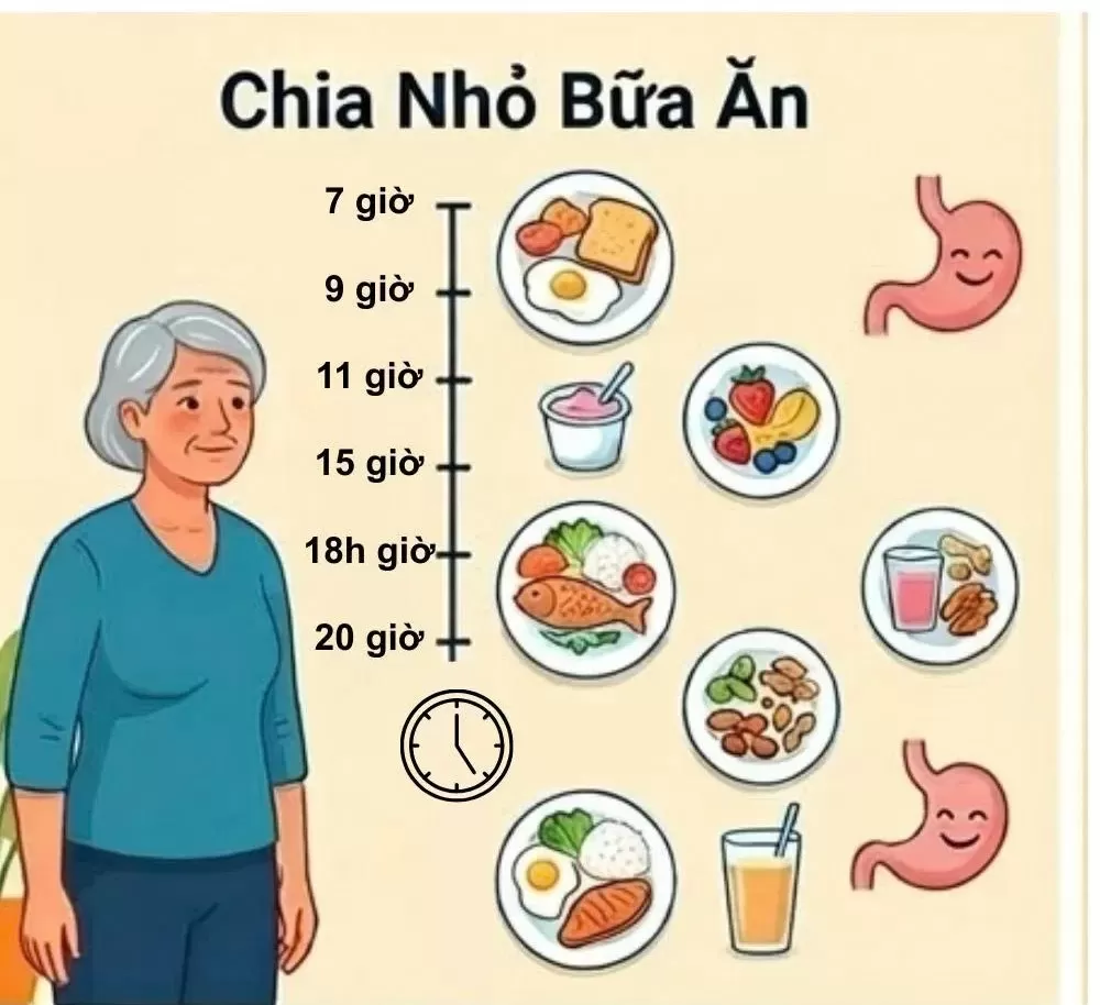 Thay vì 3 bữa chính như thường lệ, kế hoạch này chia thành 5-7 bữa/ngày (3 bữa chính + 2-4 bữa phụ). Cách ăn này giúp giảm buồn nôn, dễ tiêu hóa và hấp thu dinh dưỡng tốt hơn - đặc biệt quan trọng khi bạn bị tác dụng phụ của điều trị.