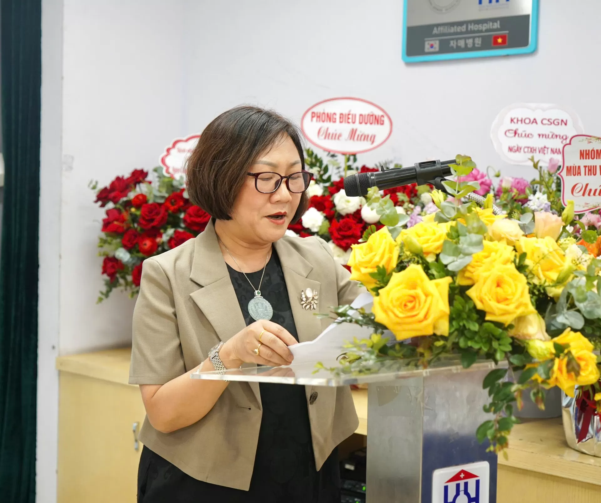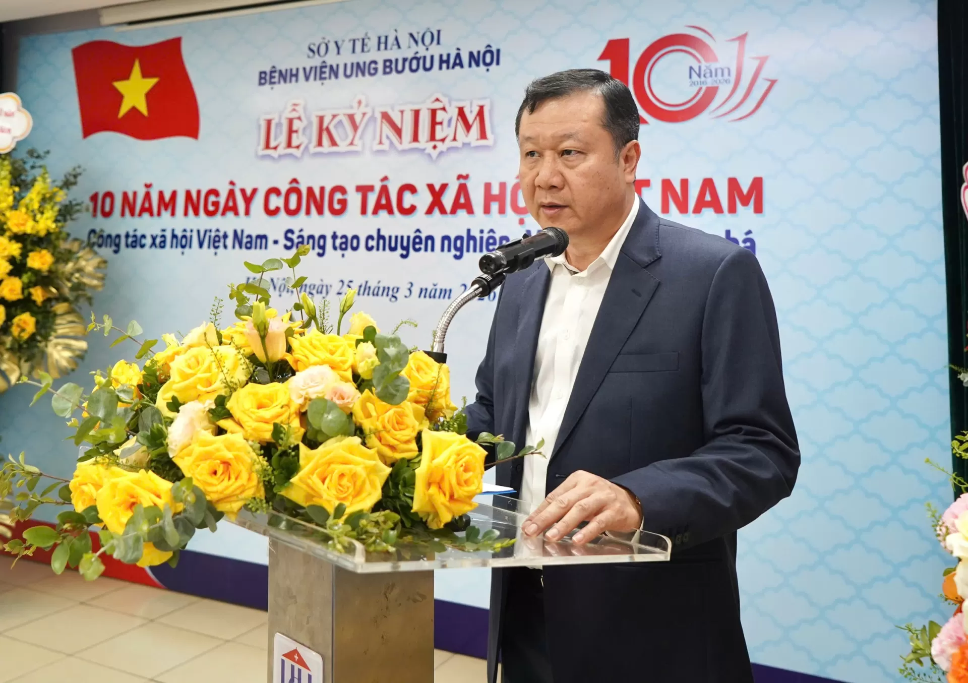 Phát biểu chúc mừng tại buổi lễ, PGS.TS. Phạm Tiến Nam – Phó Chủ tịch Hội Công tác xã hội ngành y tế Việt Nam đã ghi nhận và đánh giá cao cách làm việc chuyên nghiệp, bài bản và đầy nhiệt huyết của đội ngũ công tác xã hội tại Bệnh viện Ung Bướu Hà Nội. Đồng thời, trong không khí trang trọng, đại diện Hội đã đón nhận lẵng hoa chúc mừng từ Bệnh viện Ung Bướu Hà Nội như một lời tri ân sâu sắc đối với vai trò định hướng, kết nối và đồng hành của Hội trong phát triển công tác xã hội tại các cơ sở y tế.