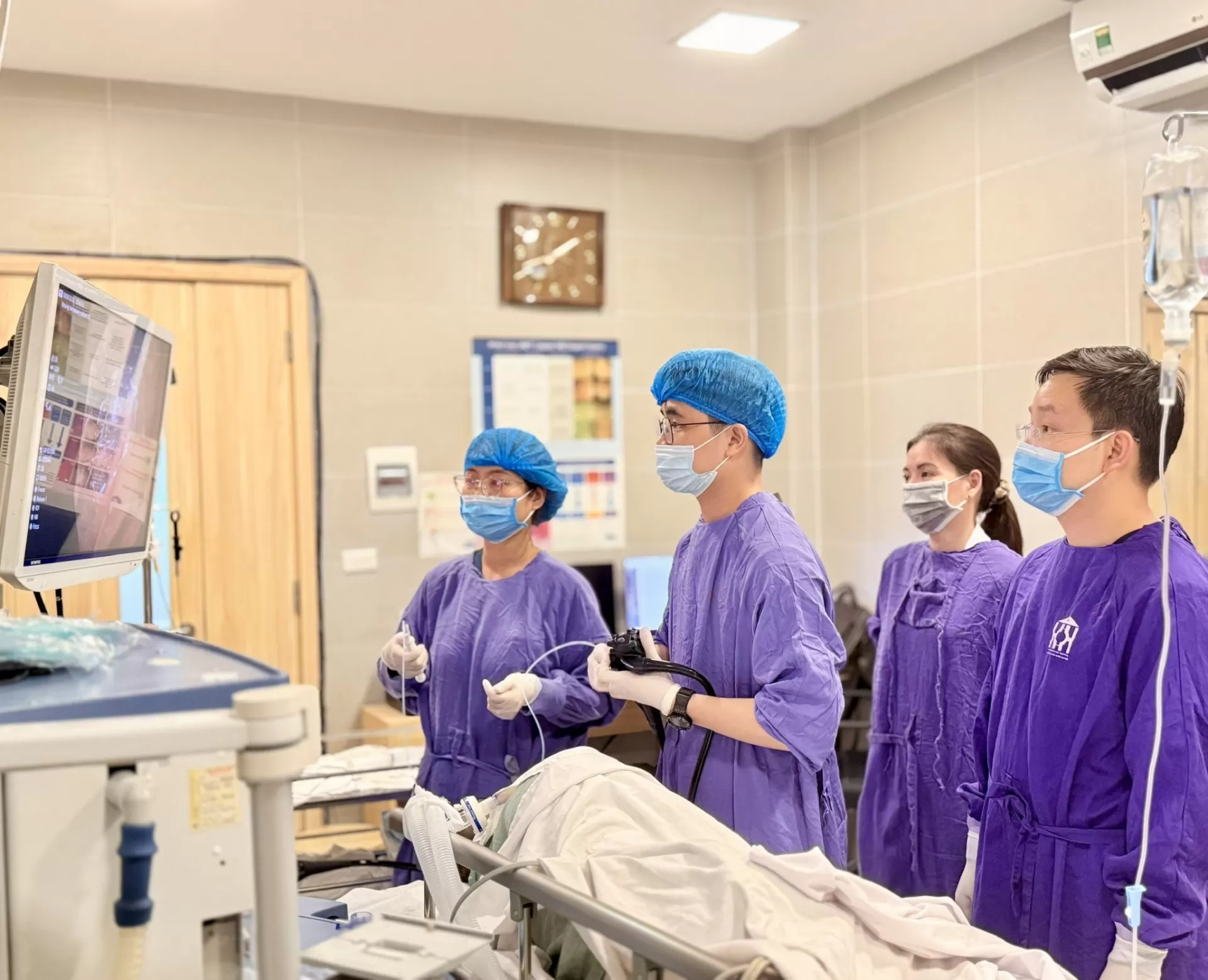 Hình ảnh các bác sĩ đang thực hiện nội soi can thiệp tại Bệnh viện Ung Bướu Hà Nội