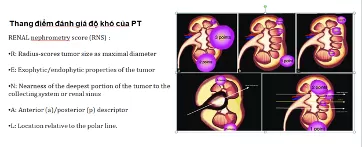 - Đối với khối u thận việc xác định chính xác khối u và xác định vùng cắt u là một bước rất quan trọng trong phẫu thuật. Có những khối u có vị trí rất phức tạp và gần như không thể cắt được thận bán phần như u ở vị trí rốn thận hoặc u lớn ở cực giữa thận. Để xác định được một khối u có thể cắt được bán phần hay không các Bác sỹ đã đưa ra rất nhiều thang điểm để đánh giá khối u thận và một trong những thang điểm phổ biến nhất là thang điểm R.E.N.A.L