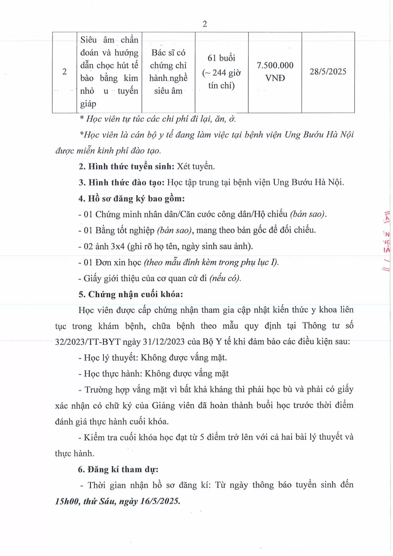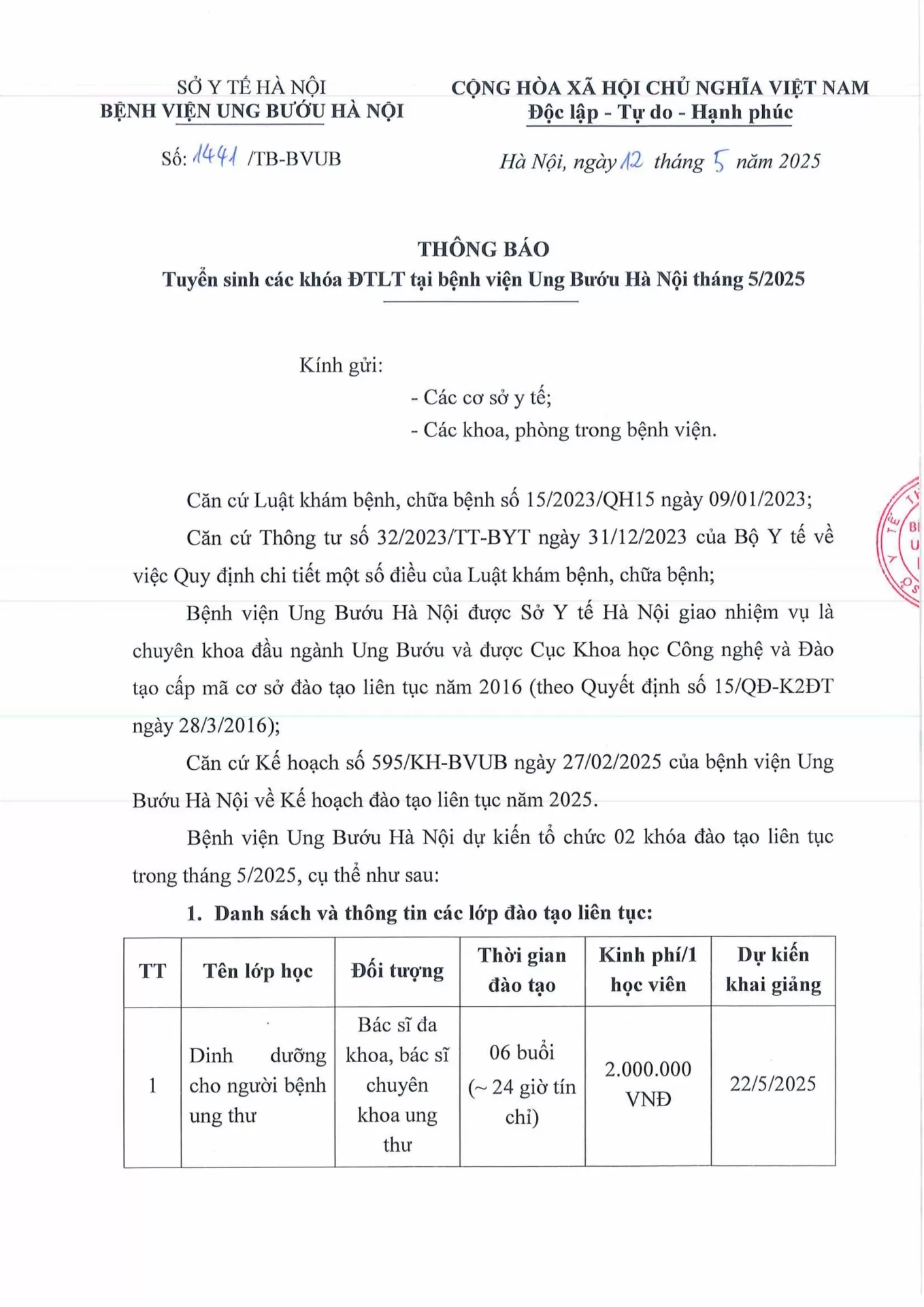 Thông báo tuyến sinh các khóa Đào tạo liên tục tại bệnh viện UBHN tháng 05/2025Bệnh viện Ung Bướu Hà Nội dự kiến tổ chức 02 khóa đào tạo liên tục trong tháng 05/2025, cụ thể như sau Tải xuống thong-bao-tuyen-sinh-cac-khoa-Dtlt-tai-benh-vien-ung-buou-ha-noi-thang-5-2025.pdfChia sẻ: