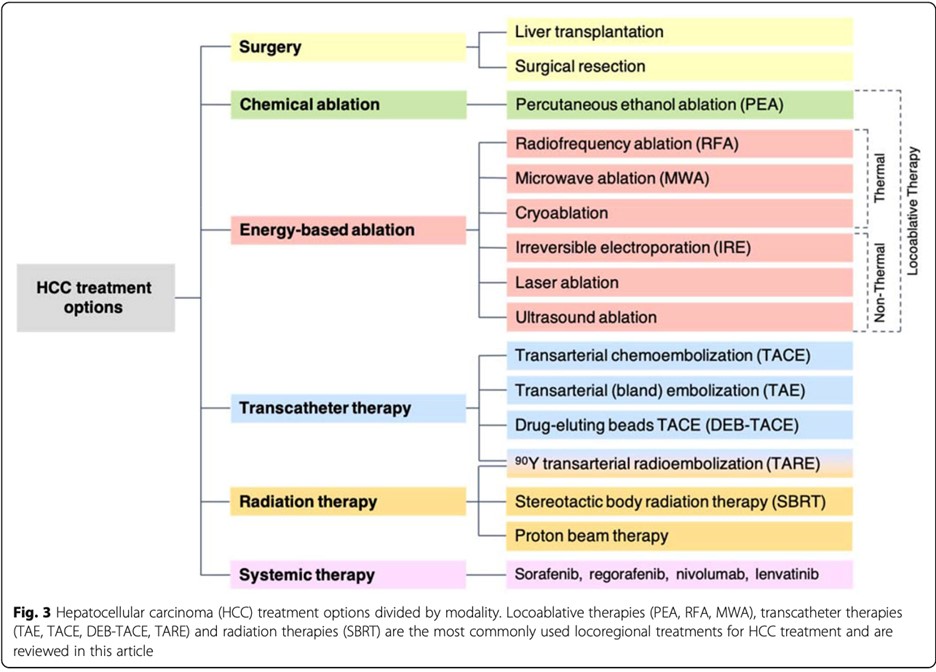 Tiêu hủy tại chỗ khối u gan là phương pháp thay thế cho phẫu thuật đối với những u kích thước nhỏ (dưới 3 khối và kích thước <3cm; hoặc 1 u kích thước < 5cm; những trường hợp u > 5cm thì cần được hội chẩn), với ưu điểm là bảo tồn nhu mô gan, tỉ lệ biến chứng và tử vong thấp hơn so với cắt gan. Các phương pháp chính bao gồm: sử dụng hóa chất (tiêm cồn khối u gan qua da - PEA) và sử dụng năng lượng. Trong loại sử dụng năng lượng được chia thành sử dụng nhiệt (đốt sóng cao tần – RFA, vi sóng – MWA, điều trị áp lạnh – Cryoablation) và không sử dụng nhiệt (xung điện trường không thể đảo ngược – IRE, liệu pháp lase, liệu pháp siêu âm).